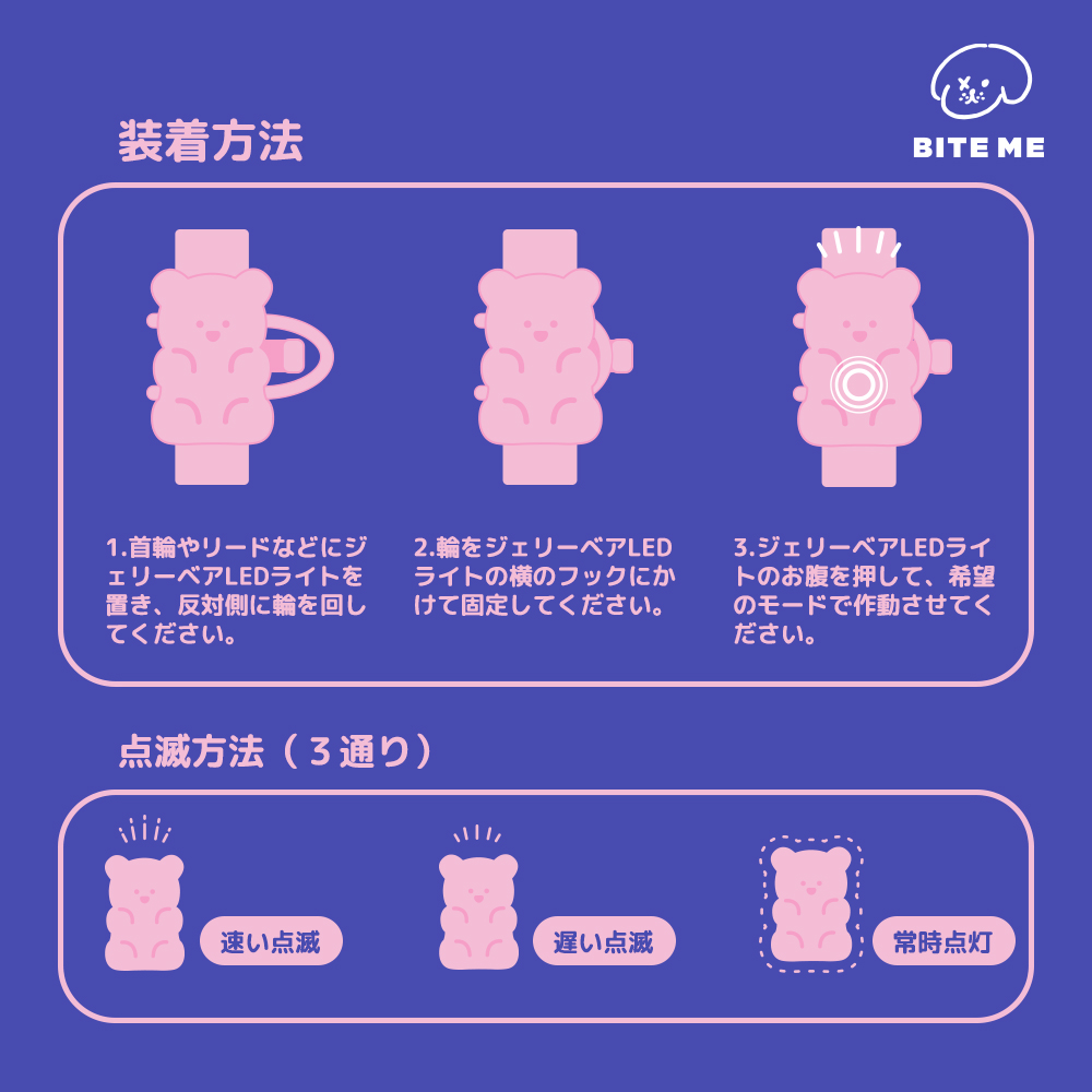 暗い夜のお散歩にはジェリーベアLEDライトが必要です! 鮮やかな LED、面倒なバッテリー交換のない TYPE- C の充電方式 そして安心のプレミアムシリコンを使用しています。 (医療機器や幼児用品に使用するLFGBグレードのプレミアムシリコン100%)